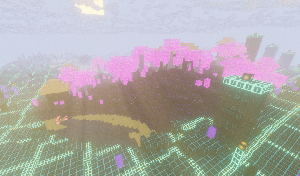 There's no multiplayer server. Instead, players discover each other's builds as they explore. Load into a chunk and the game fetches any child inscriptions — other players' permanent creations materialize around you.