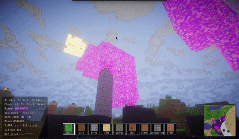 Own a chunk, build on it, and inscribe your changes as a child inscription. Your builds become permanent — encoded on Bitcoin forever. Other players see your creations when they load into the world.