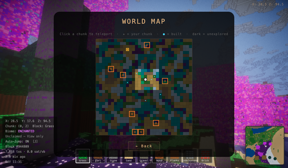 The world map reveals explored territory and highlights chunks with builds. Teleport anywhere with a click. Watch the world fill in as more builders inscribe their visions.